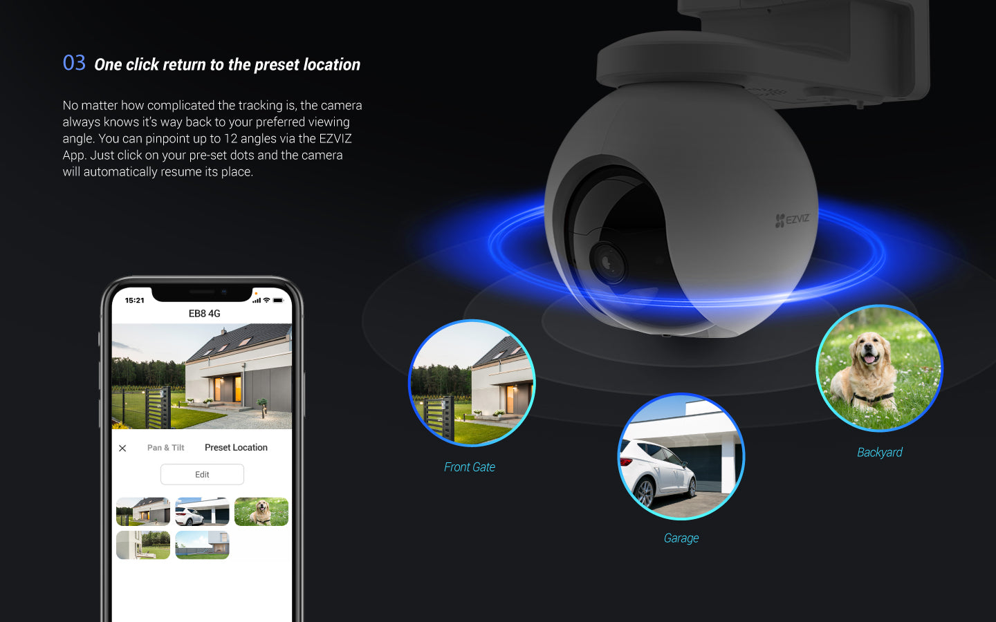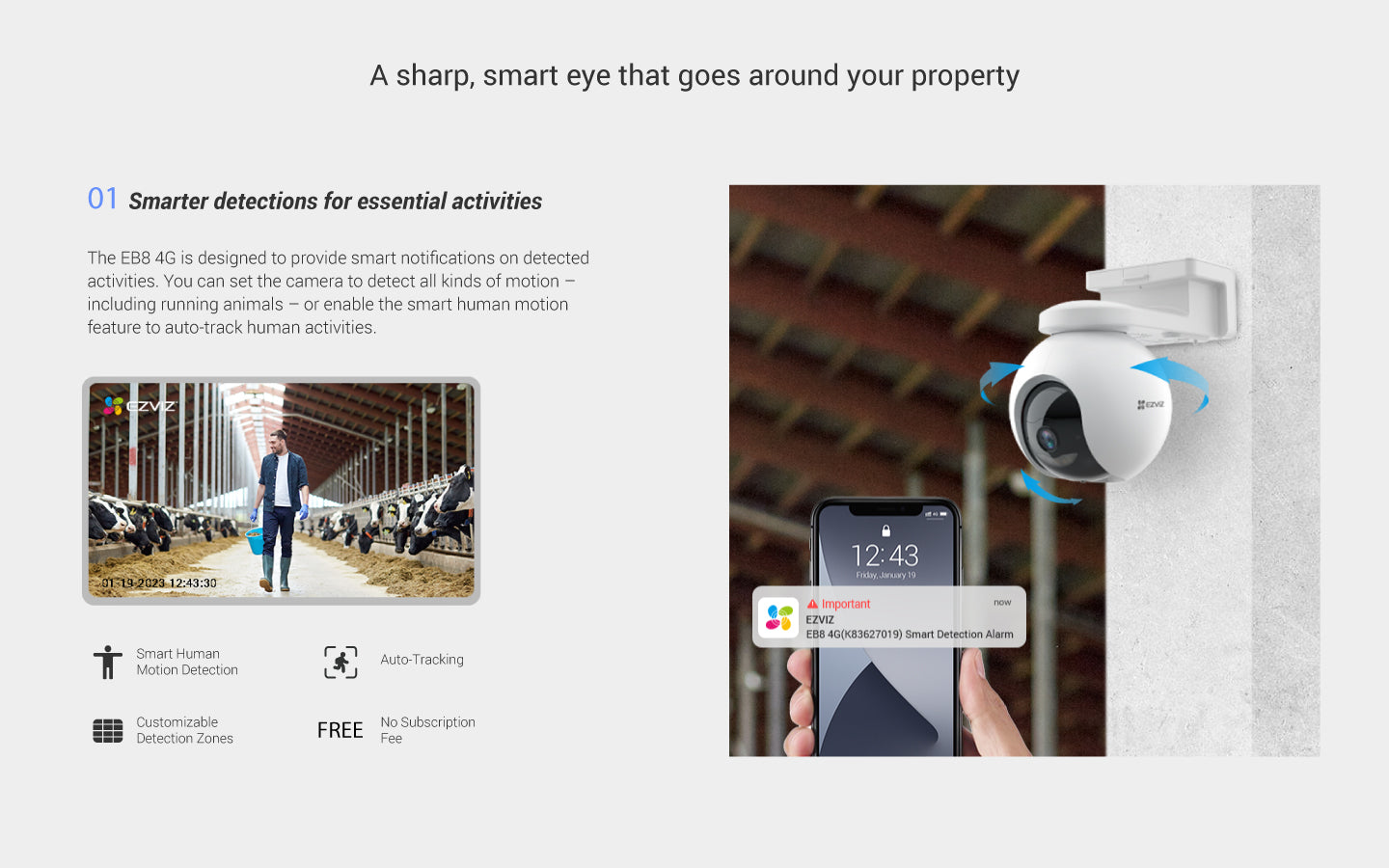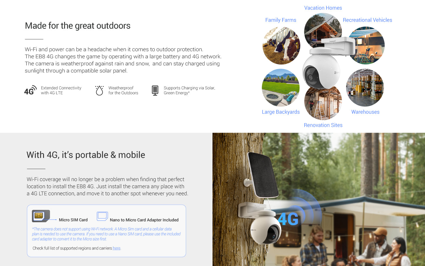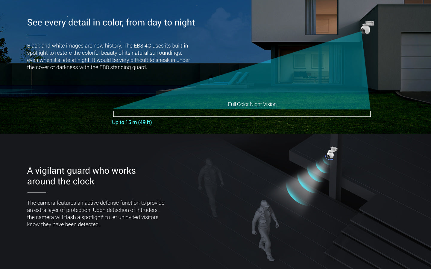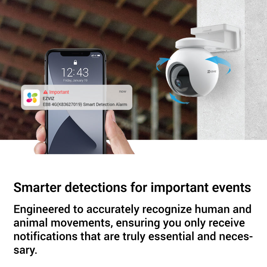 Now, it’s easier than ever to put security in action in the places you care about most. EZVIZ’s newest camera overcomes installation limitations caused by networks or electricity. The EB8 4G is battery-powered with no strings – or cords – attached. It operates on 4G LTE networks in the outdoors where Wi-Fi may not be available. It also inherits key features from EZVIZ's popular outdoor pan & tilt predecessors to provide smart and reliable protection 24/7.