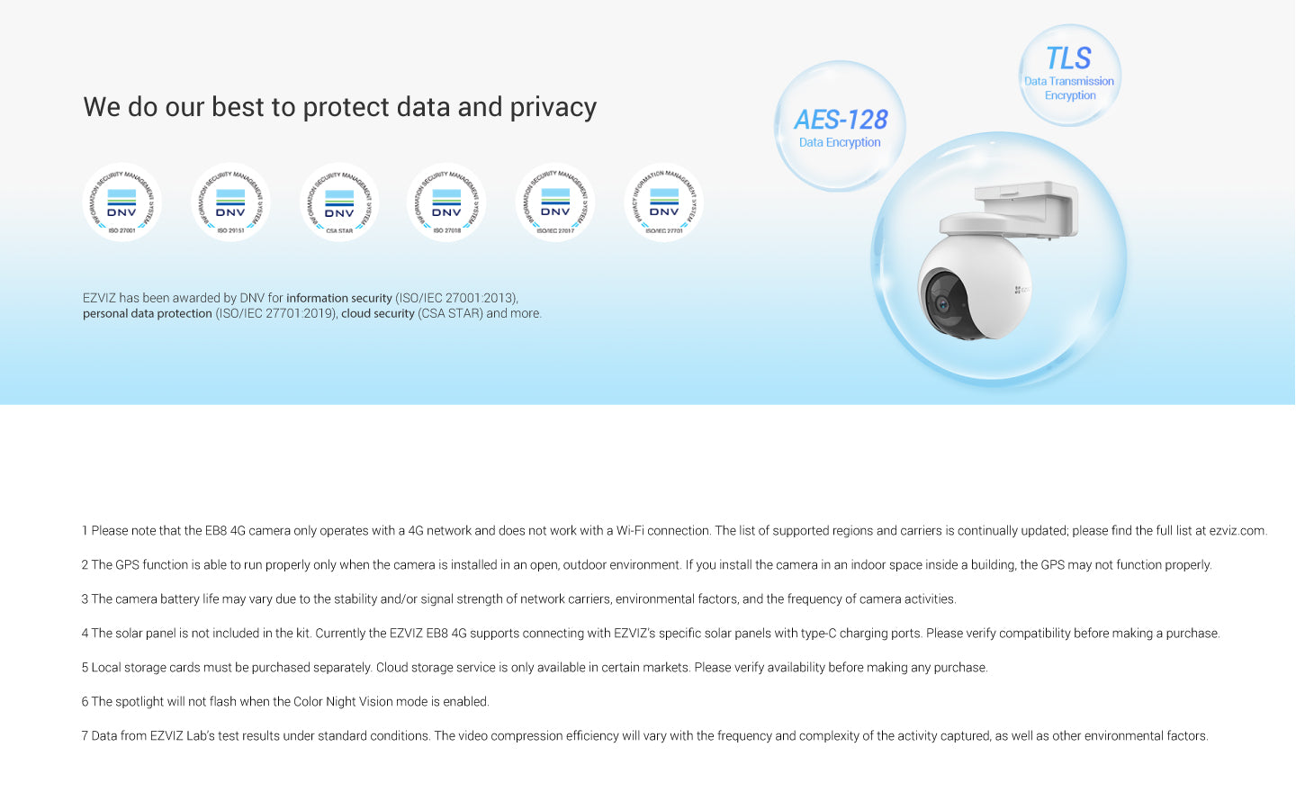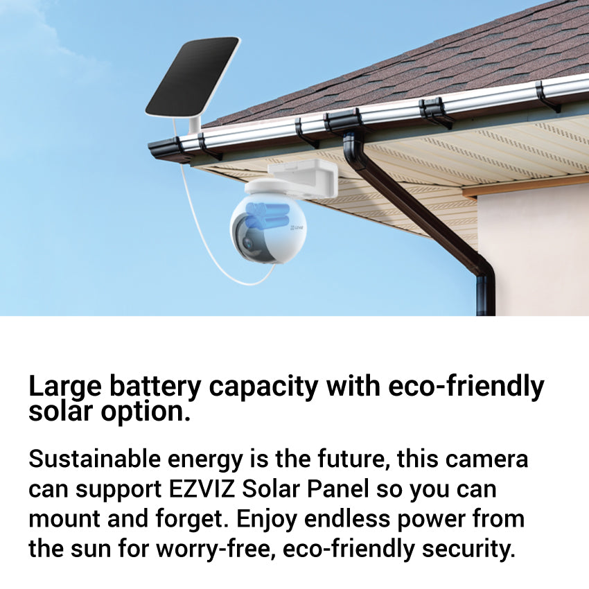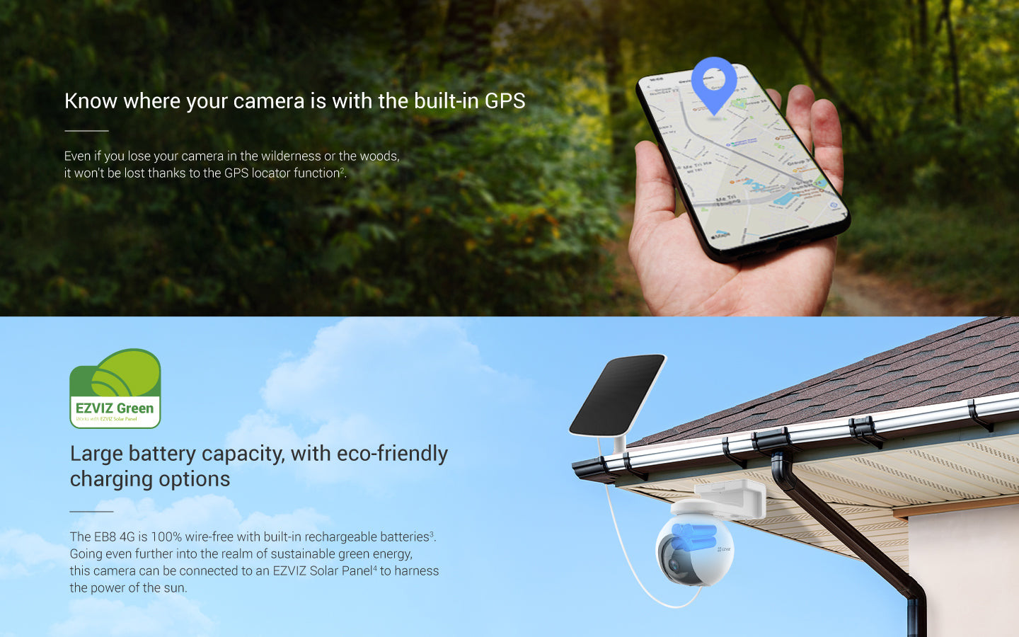 The EB8 4G is 100% wire-free with built-in rechargeable batteries³. Going even further into the realm of sustainable green energy, this camera can be connected to an EZVIZ Solar Panel⁴ to harness the power of the sun.