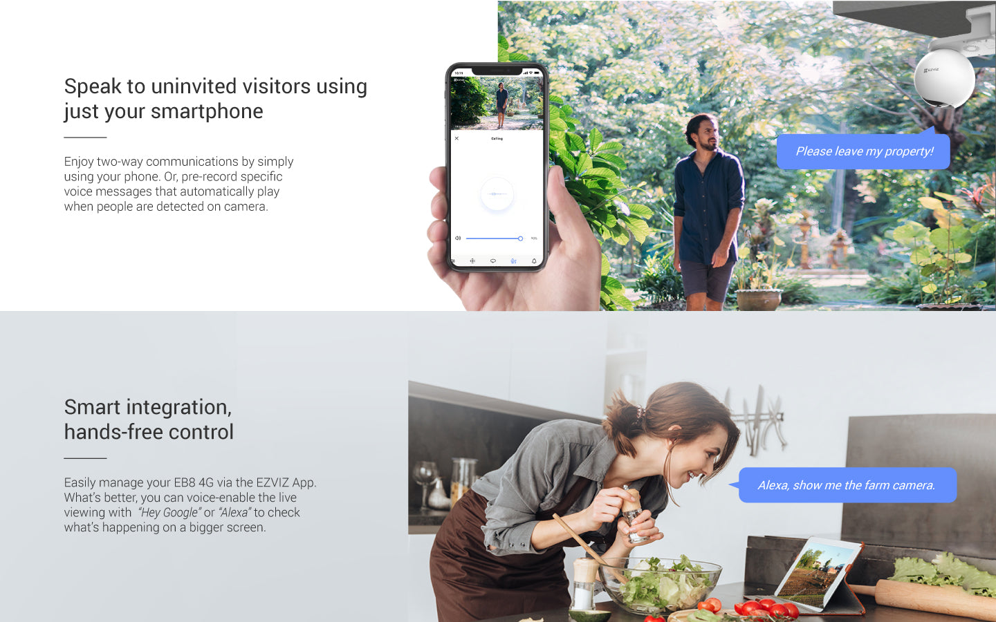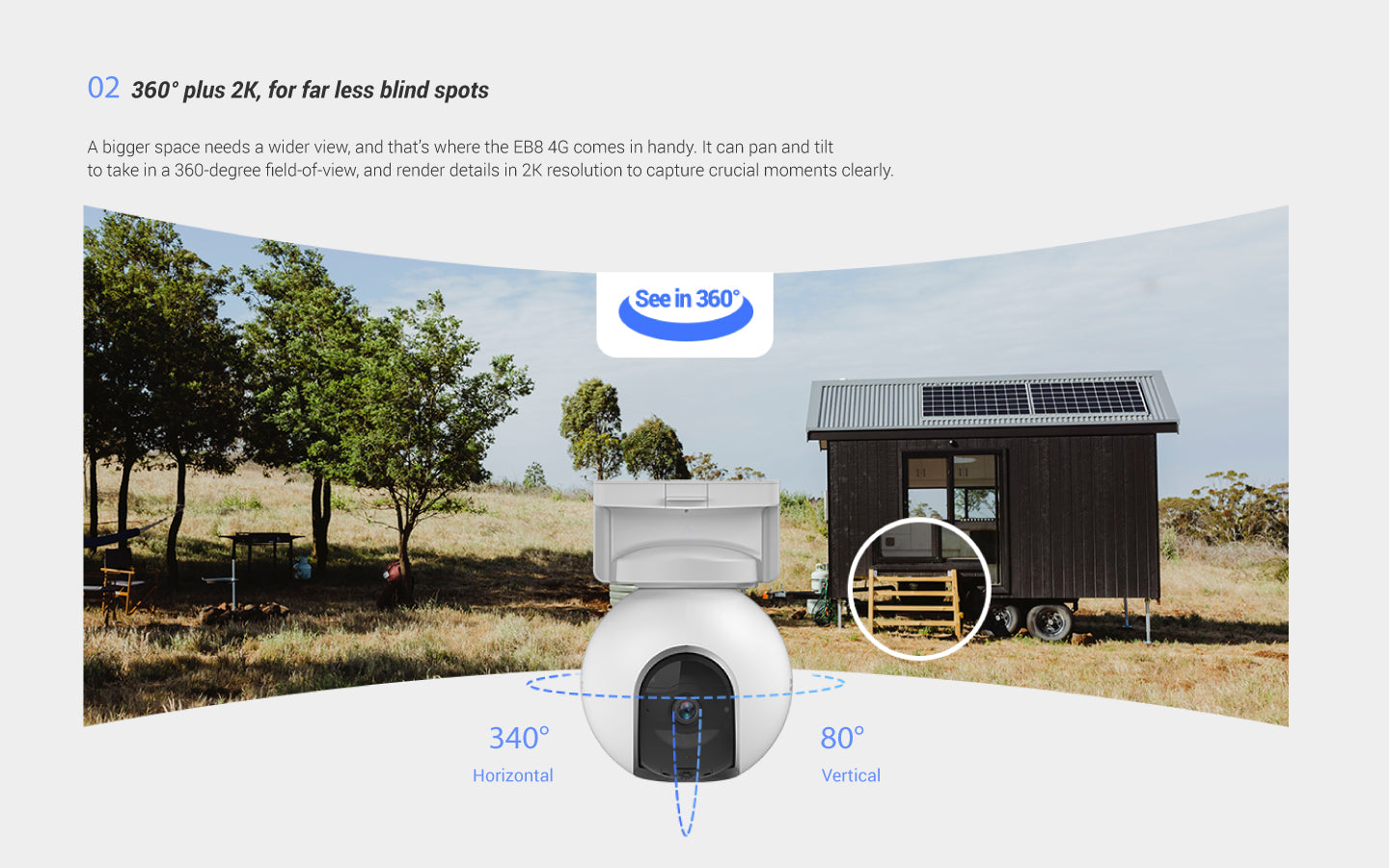 Wi-Fi and power can be a headache when it comes to outdoor protection. The EB8 4G changes the game by operating with a large battery and 4G network. The camera is weatherproof against rain and snow, and can stay charged using sunlight through a compatible solar panel.